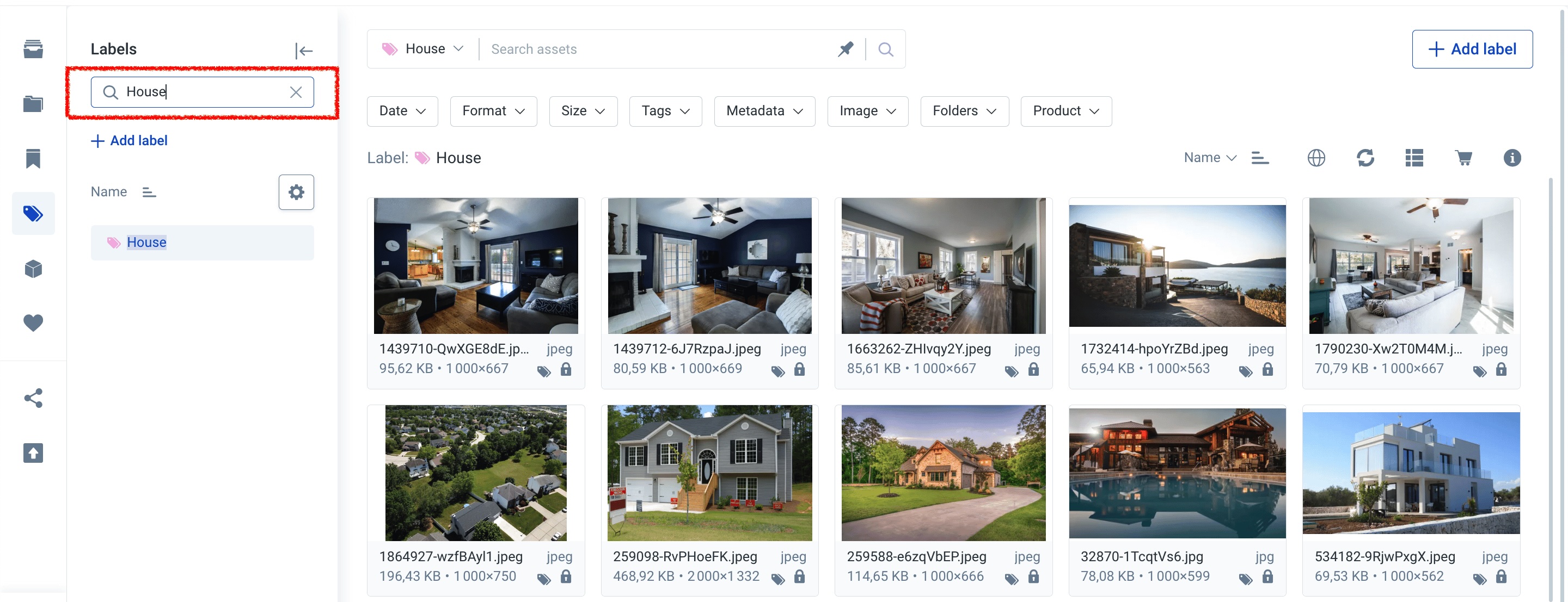 If you are interested in finding all assets assigned to a specific label, you can search for this label's name in the Search box at the left panel and then click on the result.