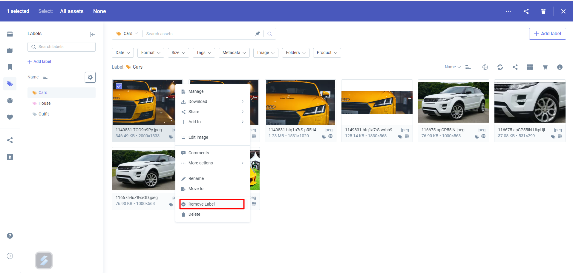 *Labels* allow users to organise their assets in a more structured and permanent way than *Tags*. Unlike the dynamic Collections whose assets change through applicable filters, they are static and are similar in principle to the labels on physical products (drinks, foods, clothes).