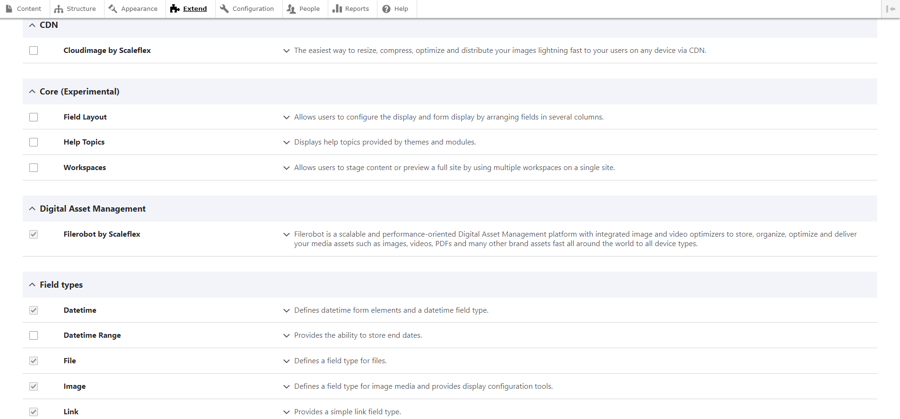composer require 'drupal/filerobot_by_scaleflex:^1.0'Step 2: In the Drupal admin, navigate to Extend / find Filerobot by Scaleflex / Install