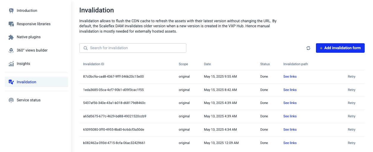 Click the refresh icon (next to **+ Add Invalidation form**) to reload the invalidation log and view the latest updates.