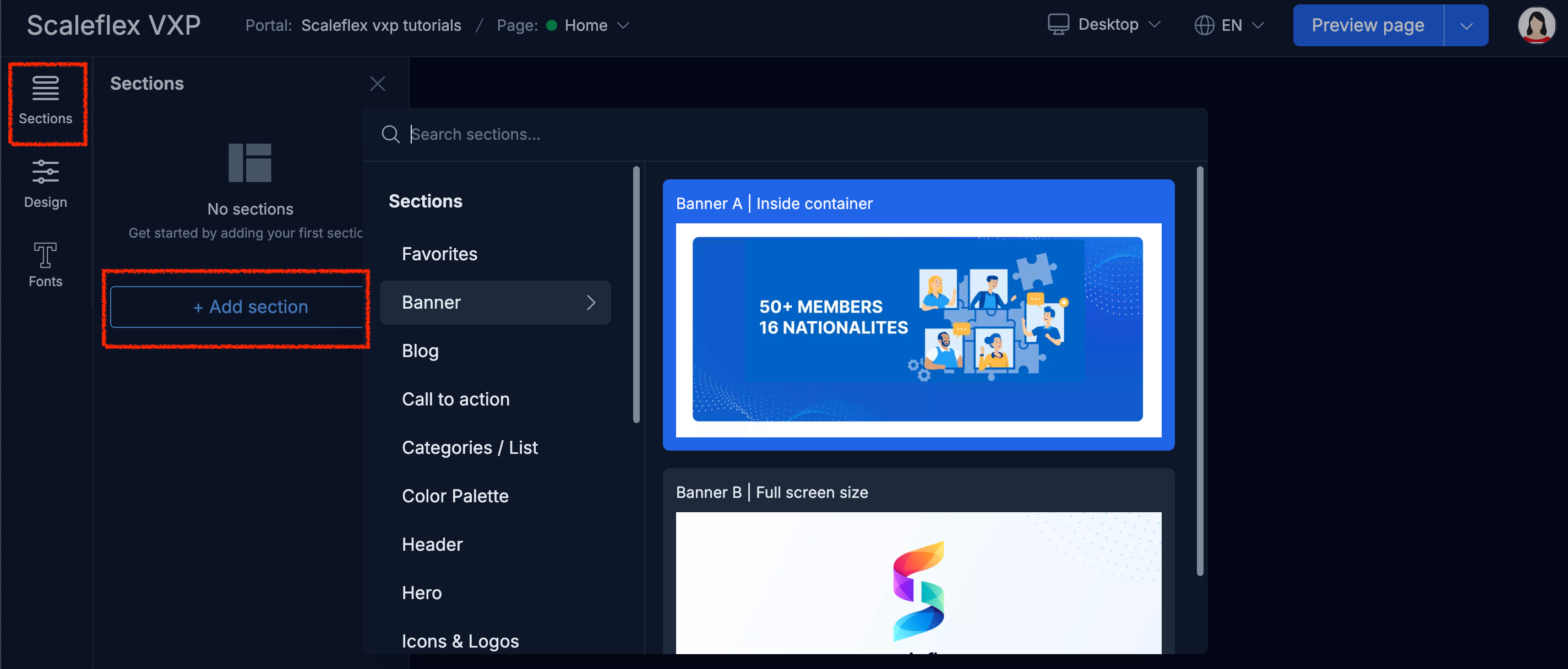 After creating a custom page, you must add sections to get started.