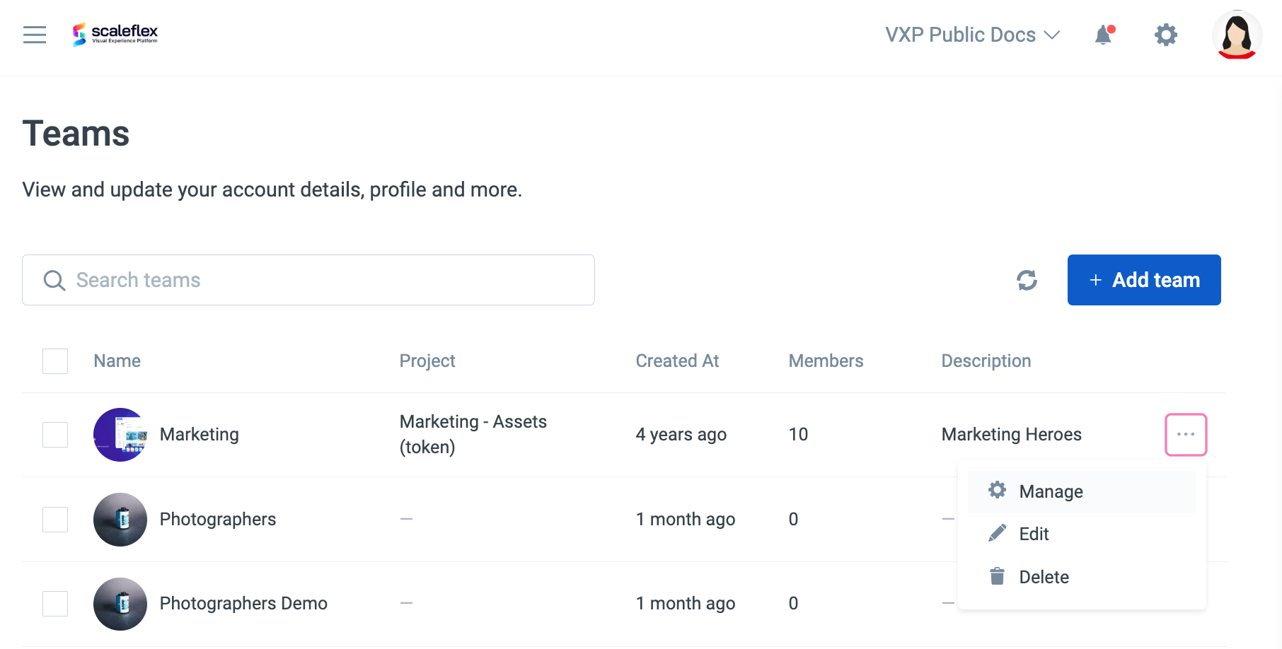 After a Team is created, you can find it in the list of existing teams. Click the `...` icon at the most-right part of the screen and choose "Manage".